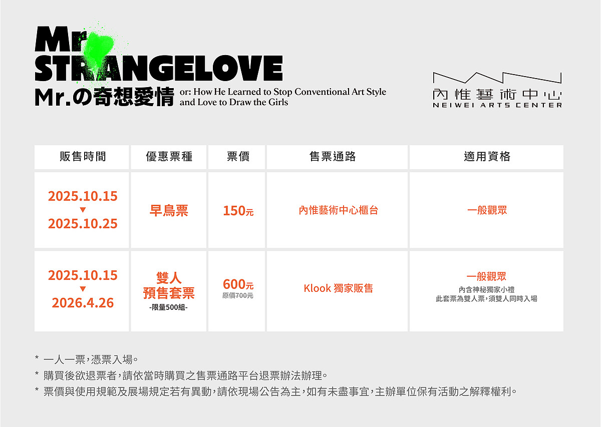 高美館《馮.沃爾夫的花園堡壘》與內惟藝術中心《Mr. の奇想愛情》兩展早鳥票($150/張,原價$300)於10月15日至10月25日限時販售。《馮.沃爾夫的花園堡壘》特展早鳥票可至高美館售票中心、ibon售票系統購買;《Mr. の奇想愛情》早鳥票則於內惟藝術中心售票櫃台現場獨家販售,全票、優惠票種自10月26日起全通路同步啟售。
