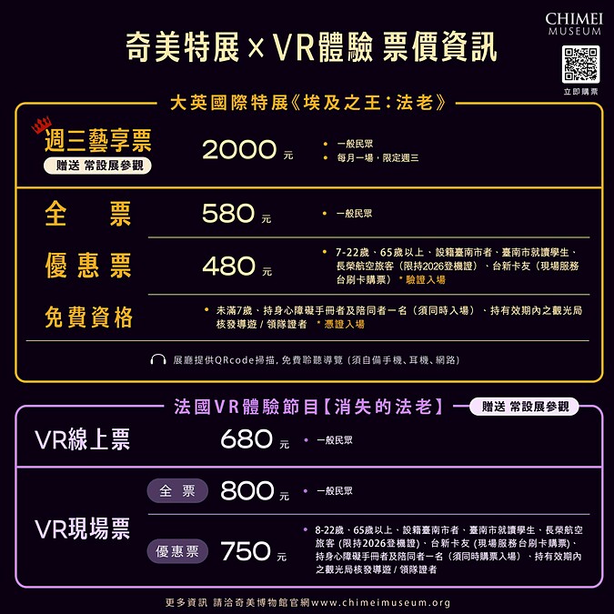 奇美博物館今年啟動全新展廳「VR 體驗廳」,與 VIVE Arts 合作,將法國 VR 探險體驗先驅 Excurio 的人氣作品《消失的法老》帶來臺灣,藉此呼應來自大英博物館的超級大展《埃及之王:法老》,打造虛實整合的古埃及體驗。45分鐘的作品絕無冷場,用不同視角穿梭在金字塔內外與時空中,宛如真實體驗,又超越身體能夠抵達的旅程。