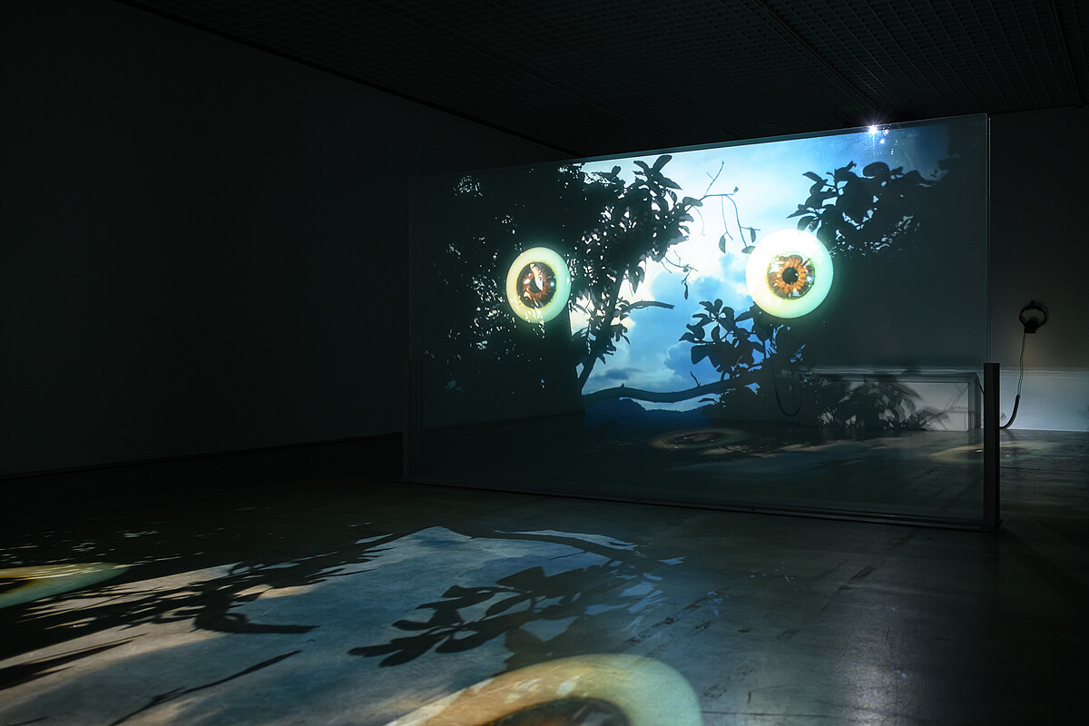 阿比查邦・韋拉斯塔古(Apichatpong Weerasethakul)以1981年泰國恐怖電影「空眼之鬼」故事為靈感的《日光》(Solarium,2023),雙重投影穿過玻璃結構,讓影像如同無主的靈光漂移至空間裡,彷彿在尋覓一具由光構成的身體。