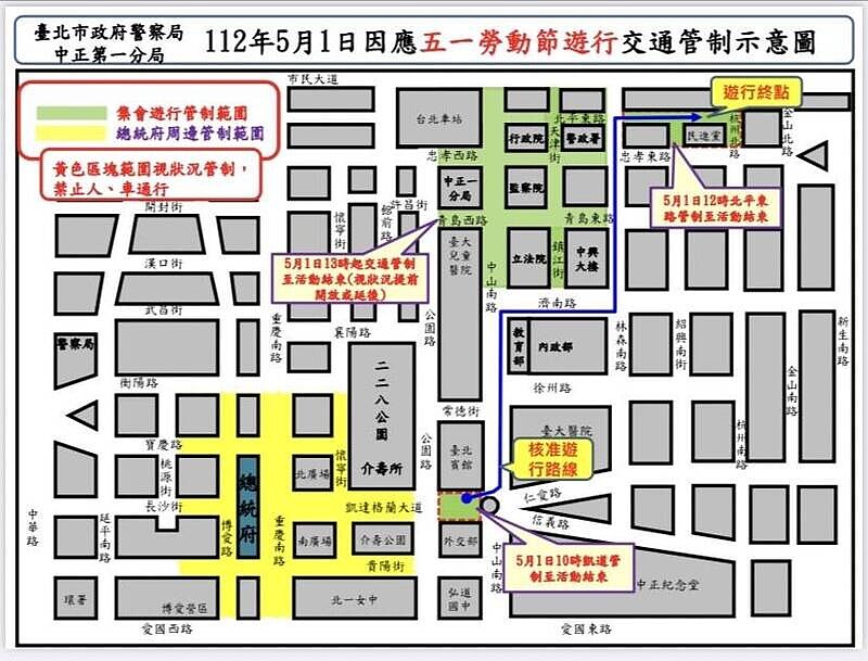 「五一行動聯盟」 將在5月1日舉辦「連續執政無蜜月,國會修法護勞權」遊行,地點是總統府前凱達格蘭大道和濟南路。除此之外,網紅「通勤者之歌」也在這天舉行「五月零壹 交通起義」,號召所有車友一起到交通部抗議,交通管制的路線可以參考下面的示意圖。