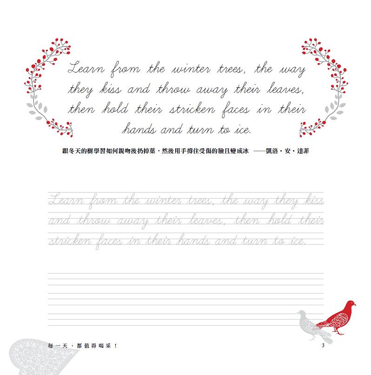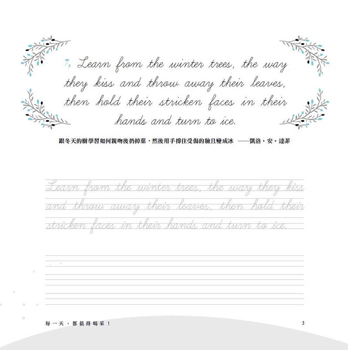對於優美佳句的記憶,必然發生在抄寫之中。不抄寫,絕對過目即忘。因此臨摹抄寫是引領你銘記英文格言的第一步。而在記憶的當下,你不僅將優美的英文佳句放進心裡,無形中也累增自己的英文力。