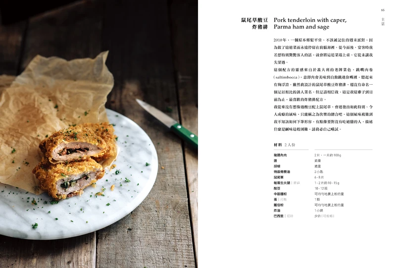 2010年,一個原本稀鬆平常、不該被記住的週末派對,因為做了這道菜而永遠停留在我腦海裡。從今而後,宴客時我若想特別驚艷客人的話,就會將這道菜端上桌,它從未讓我失望過。這個配方的靈感來自於義大利的老牌菜色,跳嘴肉卷(saltimbocca),意即肉會美味到自動跳進你嘴裡,聽起來有夠浮誇。雖然我設計的鼠尾草酸豆炸豬排,還沒有命名一個足以相比的誘人菜名。但是請相信我,這是我這輩子到目前為止,最喜歡的炸豬排配方。我從來沒有想像過酸豆配上鼠尾草,會迸發出如此特別、令人成癮的風味,只能稱之為快樂的總合吧,這個風味複雜到我不知該如何下筆形容,有點像要對沒有吃過鹽的人,描述什麼是鹹味這般困難,請務必自己嘗試。