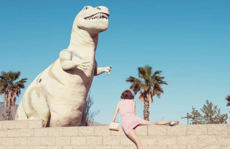 今年35歲的女性攝影師 Kourtney Roy 來自溫哥華,而後到巴黎進修攝影課程。她的攝影從構圖、美術、服裝到色彩都極為講究,明亮的光線、鮮明的色彩,每張都帶有五、六○年代的復古氛圍。她的作品也帶有濃厚的藝術氣息,如藝術家 Cindy Sherman 一樣,Kourtney Roy 喜歡化身為作品的影中人。她獨鍾在有點超現實的背景裡拍攝,每幀圖片彷彿都有各自的故事,充滿戲劇效果。黑色電影是她永恆的靈感來源,她堅信:「這個世界有秘密的潛能,能讓每個時刻都變成電影場景。」這回她替路易威登創作的《California by Kourtney Roy》無疑將加州變成了一個迷幻的成人樂園。