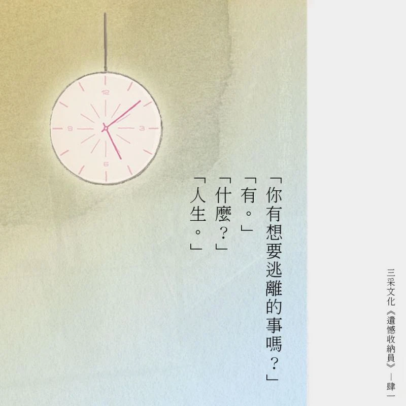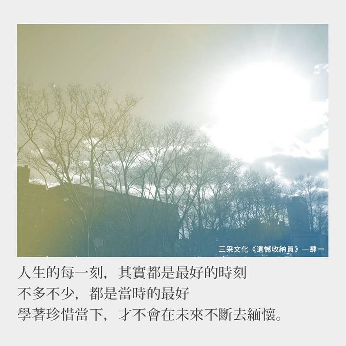 遺憾就像是雨傘上的小破洞,遇上雨天便涔涔滴著水,不知不覺淋濕一身。把遺憾傳遞到過去並不是為了要改變什麼,而是為了填滿漏洞,遺憾收納員就像是個修傘的人,替每個人修補心裡的缺憾,至少這一次下雨,可以不再濕透。」希望這本書,可以讓你覺得世界仍是溫柔,像是被擁抱著。而你,往後還是會哭會笑,但永遠都能夠再相信自己一次。