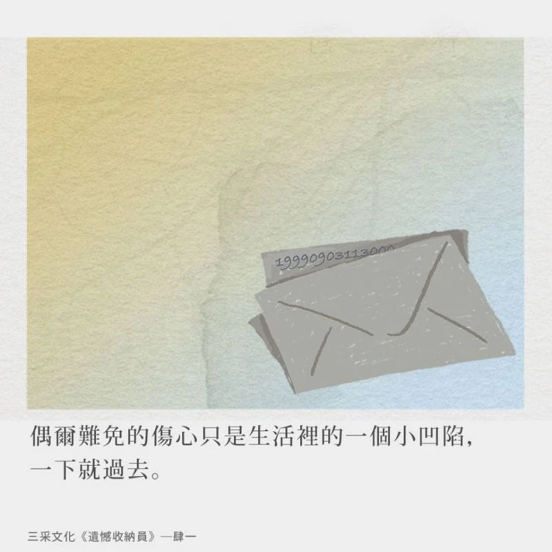 收納員:「所謂的『遺憾收納員』,並不是收納信件物品的人,而是替人們幫忙保管遺憾的人,在物歸原主之前,好好地保存著。」少年:「意思是就可以遺忘了嗎?像失憶那樣?」收納員:「不是,是可以跟過去和好了,不會再為它傷心了。」
