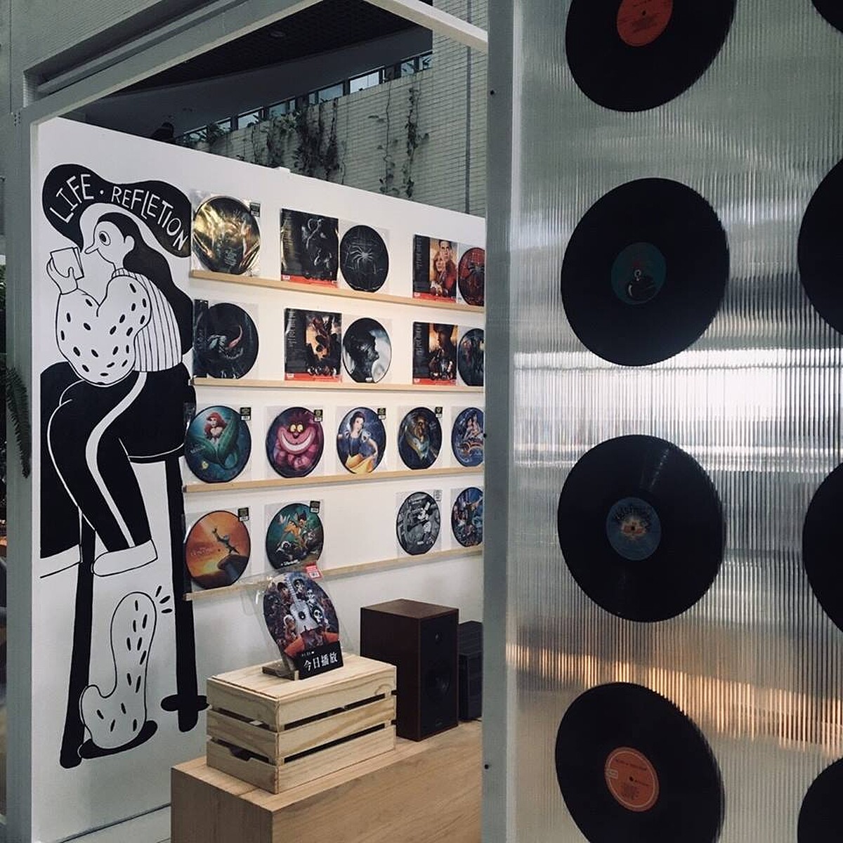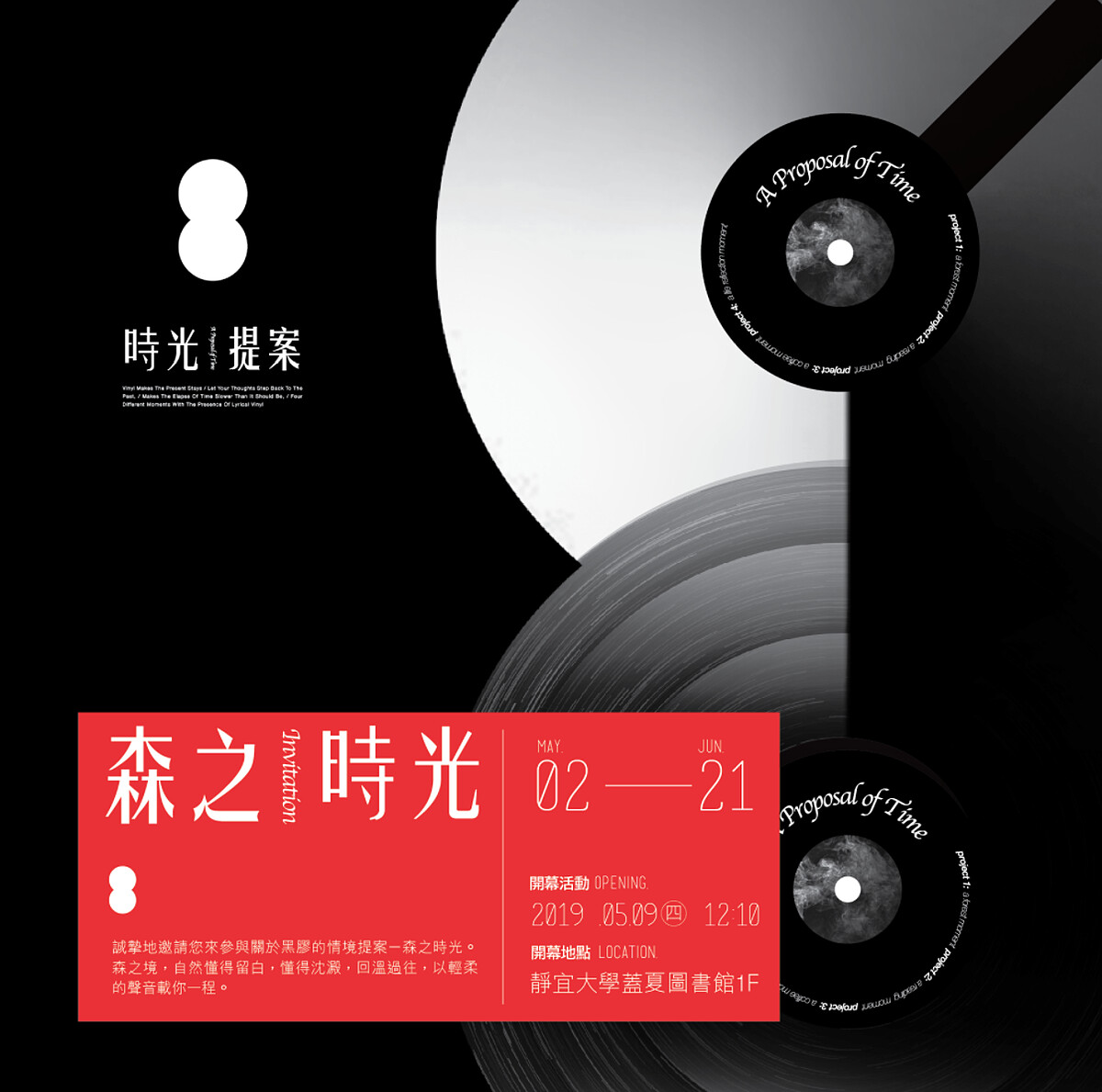 正於蓋夏圖書館館內展出,從空氣圖書館的溫室移到蓋夏圖書館設置,溫室裡陳列了館內收藏老唱片與多肉植物交會,當漫步在溫室裡,欣賞牆上有著歷史刻痕的唱片,綠意交錯間,配上懷舊的歌聲,不自覺勾起記憶中往昔時光的美好。「時光提案」希望藉由植栽與黑膠的搭配,在喧囂的生活裡,為各位提供一個心靈沈澱的角落。