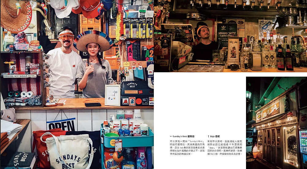 我對中目黑、惠比壽一帶很熟,以前來到東京時,就經常跟玩滑板的朋友一起到中目黑吃吃喝喝。我們最後一攤永遠是去間叫做「Baja」的小酒吧,點幾杯酒精濃度頗高的「Baja Man」調酒、吃幾個香辣TACO餅,然後愉快地失去記憶。Baja(發音「巴哈」)是一間很小很小的店,店內充滿舊美國風情的街頭品牌裝飾,幾乎沒什麼座位,只要站進去10 個人就差不多塞得滿滿的了,也因為又小又擠,在那兒總是能認識相同生活圈的新朋友;通常也都是朋友的朋友。我認為每個人都應該要熟識間能讓自己感覺像回家的酒吧,不用特地約束訂位,只要走進來自然能跟人聊開,重點是喝到不醉不歸。對我來說,已經超過15年歷史的Baja就是這樣一個地方。