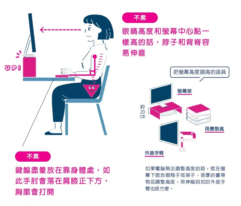 累:讓身體習慣電腦環境/不累:讓電腦螢幕配合自己的眼睛高度