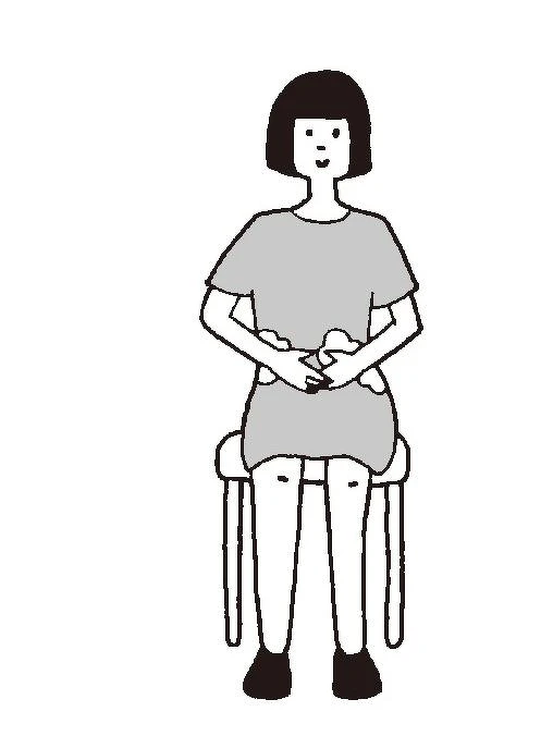 行坐姿時,背不要靠著椅背、也不要坐得太滿,膝蓋稍微張開。如果採用跪坐也要記得稍微把膝蓋張開。打直背部,想像自己從頭往天直直拉高的感覺。雙手交疊,置於丹田(下腹部)。