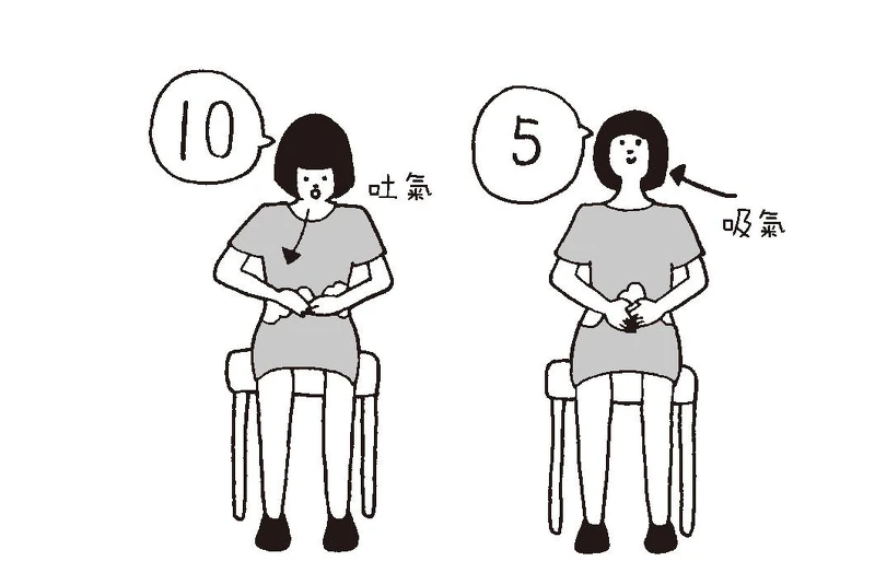 在記住吸氣及吐氣的方法之後,接下來要練習的是「10次深呼吸」的基礎動作。無論要拉張椅子坐,或是保持站姿都可以,在此我們先以坐姿來講解。