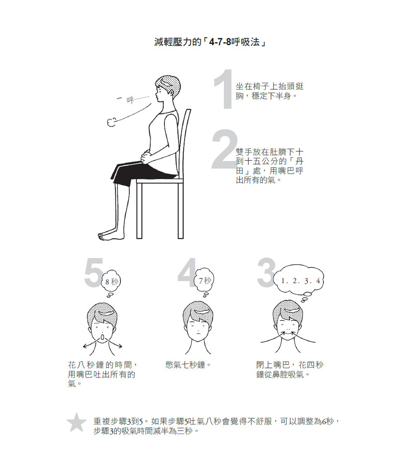 方法非常簡單。用鼻子吸氣數到四,然後憋氣數到七。接著慢慢吐氣數到八。