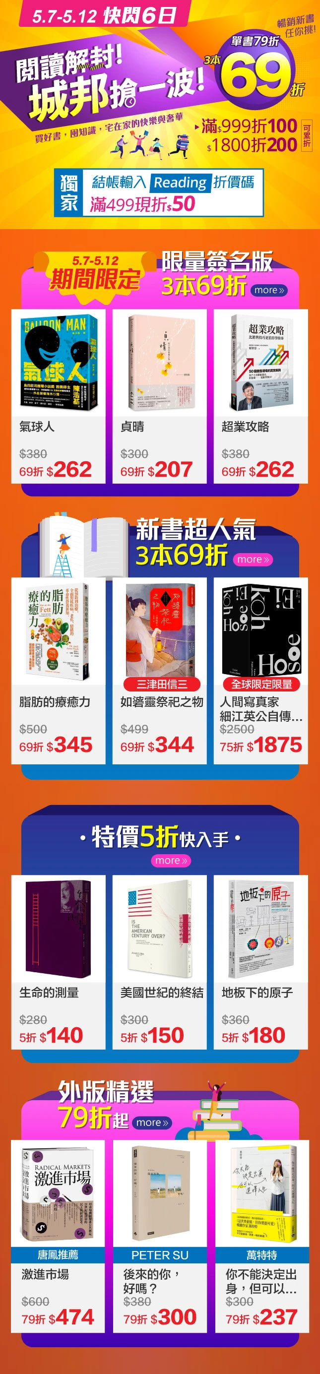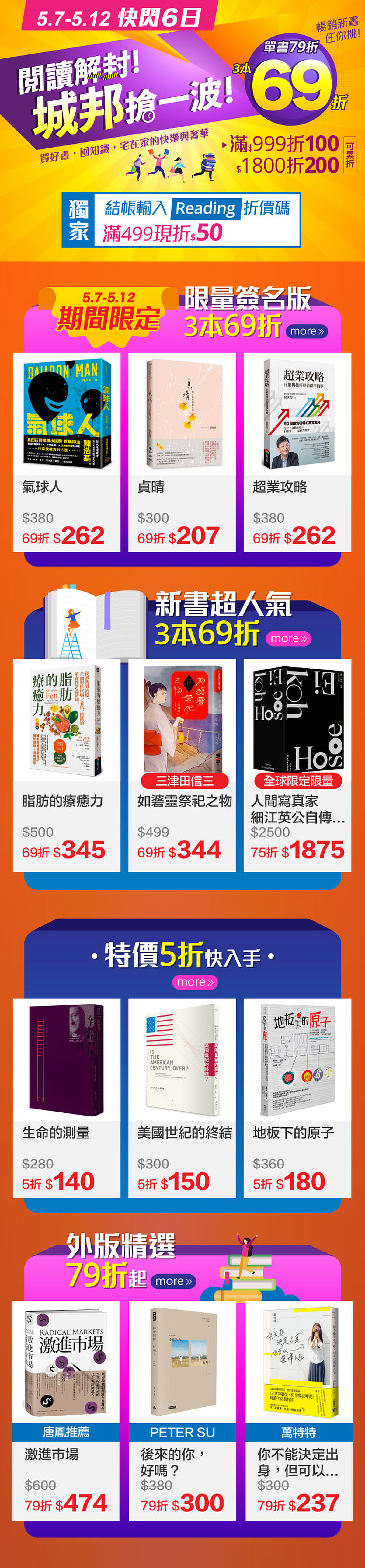 從5/7~5/12登場的「閱讀解封,城邦搶一波!」活動,凡城邦全書系都有單本79折優惠,暢銷、新書則都有69折。更好康的是,金額達999元能折100、達1800元能折200元(可累折),正是入手好書的絕佳時機。