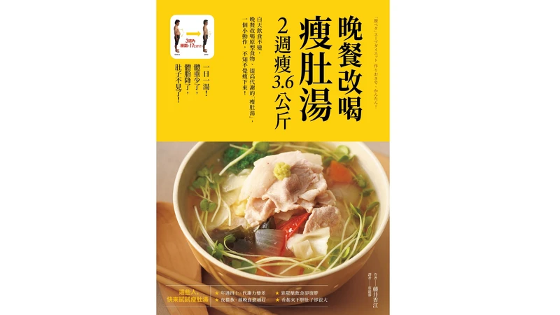 作者藤井香江曾在半年內成功減重20公斤,並維持苗條身材超過20年!她自行研發簡單果汁湯品減肥法,成為「簡易減肥法專家」。這本2019年底出版的新書正是以風靡日本的瘦肚湯為主題,分享7種必瘦湯底、20款瘦肚湯食譜,只要短短30分鐘烹調過程就能輕鬆上桌,而且還不用餓肚子,實在太神奇!