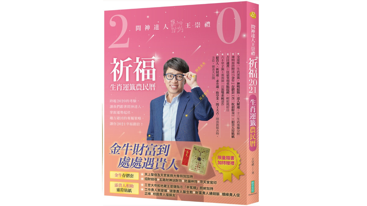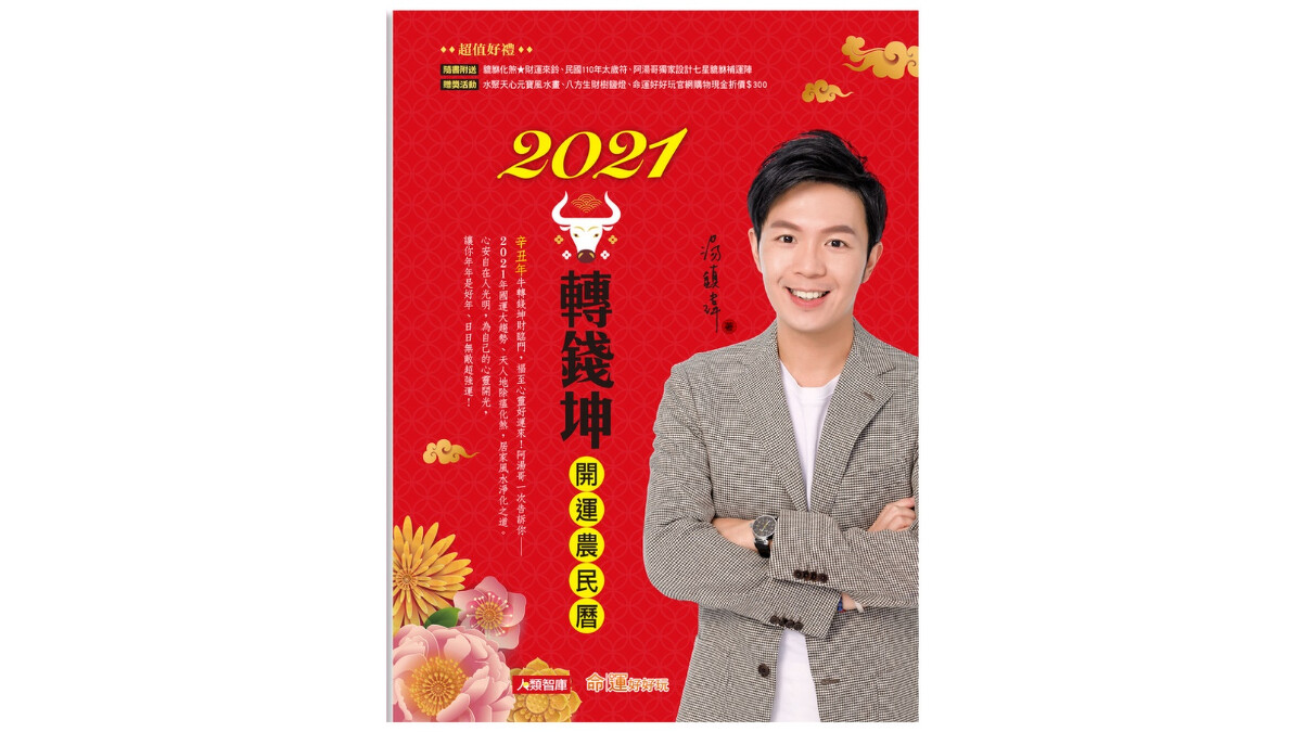 命理界「阿湯哥」湯鎮瑋新書《2021牛轉錢坤開運農民曆》化解各種疑難雜誌,12生肖全年、流月運勢外,還有居家風水淨化術、獨家傳授除瘟化煞妙招及犯太歲生肖提醒,即便身處厄運深淵,也能為自己的心靈開光。