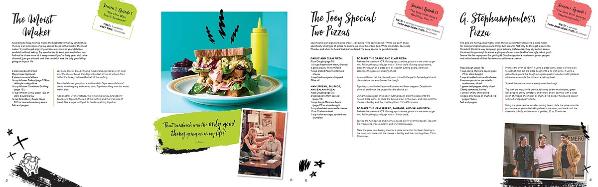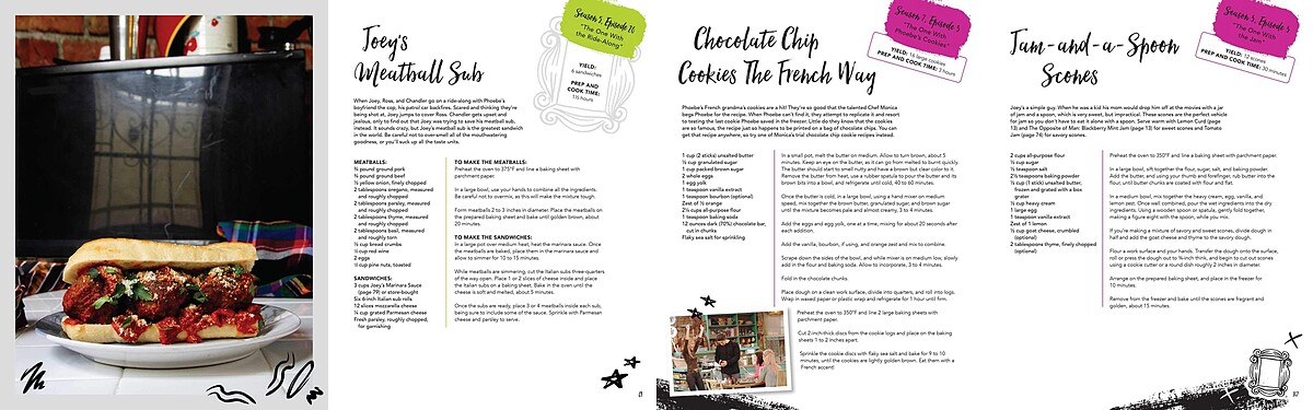 《Friends:The Official Cookbook》除了有 菲比(Phoebe )的祖母獨家秘方餅乾和拿手的巧克力曲奇餅乾、瑞秋(Rachel)招牌甜點 Trifle,以及喬伊(Joey)的起士肉丸三明治和特製的 Two pizzas;羅斯(Ross ) 的 Moist Maker 火雞三明治、錢德( Chandler)的起士蛋糕……