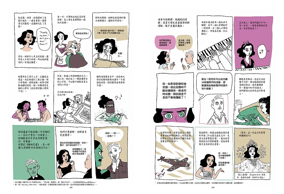 雖然海蒂樂在其中,但是她大部分的發明都無法運作。不過話說回來,她的發想通常都很不錯。她試圖盡可能認識一些有趣的人。因此才會在一次晚宴上,結識鄰座的未來派音樂家喬治・安塞爾。他寫的《機械芭蕾》,是一部讓16架鋼琴同時演奏的作品。他們什麼都聊,但聊最多的是戰爭。「留在好萊塢讓我很煩躁,空有一雙手,卻什麼也做不了!我想盡點力!我有滿腦子的想法想分享給美軍!」海蒂向他解釋,根據她的理解,美軍只要把魚雷瞄準納粹潛艇,幾乎是屢試屢敗。「他們要想辦法遠端遙控!透過無線電!」「是沒錯,但是訊號馬上會被攔截啊!」海蒂和喬治經常一起玩四手聯彈:其中一個人即興創作一段旋律,另一個人必須回應跟上,然後再交換,如此輪流。某天晚上,當他們像打乒乓一來一往時,一堆毫無關係的想法,突然串起來了。「欸⋯如果發射器和接受器⋯彼此回應時不斷改變頻率⋯兩者同時改變⋯那訊號是不 是就不會被攔截了?」「喬治!既然你可以成功讓16架鋼琴同時演奏,那要讓兩座無線電同時運作有什麼難?」聽起來有點怪,但這方法好像可行耶。喬治協助海蒂釐清她的想法,進而實際操作。整個1940年的秋天,他們都投注在研究這件事情上。