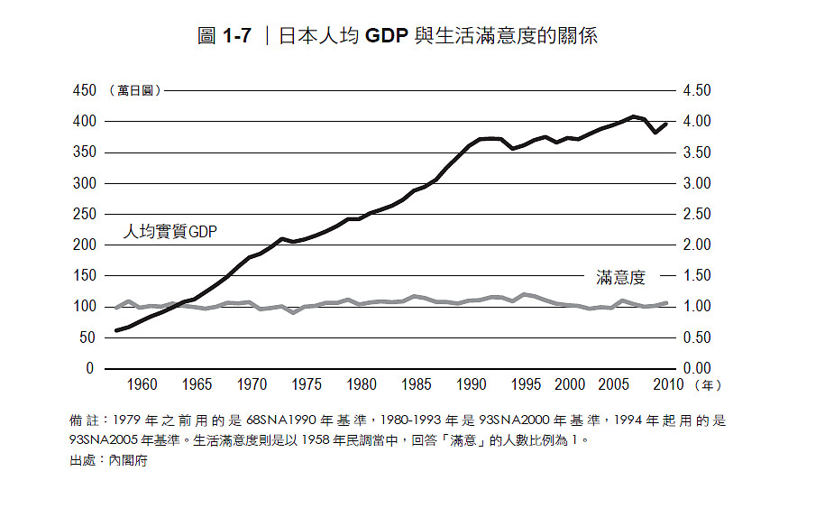 在探討「吃出幸福」(Food for Well-being)的概念時,總會令人聯想到由聯合國附屬組織「永續發展解決方案網路」(The UN Sustainable Development Solutions Network,簡稱SDSN)所發表的全球幸福度排行。它是針對全球一百五十六個國家、地區所進行的一項民調,而日本近五年來的排名,已從第四十六名(二○一五年)大幅滑落到六十二名(二○二○年),低到讓人難以判斷究竟有多差。不論如何,至少可以看出日本民眾認為自己過得不怎麼幸福。或許有很多人會認為是受到不景氣的影響,但其實並非如此。根據分析指出,從一九五四年到一九七○年的高度經濟成長期,日本的實質人均GDP扶搖直上,但對生活的滿意度卻絲毫不見起色(圖1-7)。