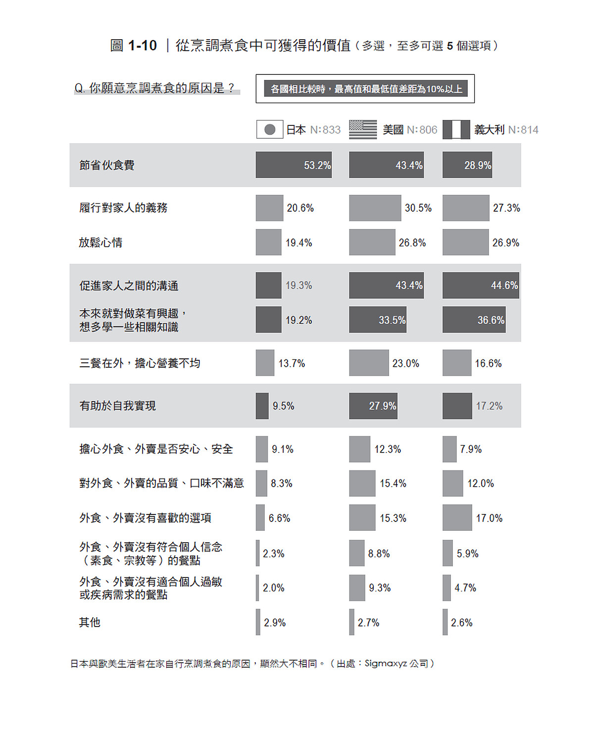 於是,在剛才的那個調查當中,也詢問了受訪者「在家下廚」的理由,還出現了一個相當耐人尋味的結果(圖1-10)――在日本,選答率一枝獨秀的是「節省伙食費」這項經濟方面的好處;但在美國或義大利,選擇「促進家人之間的溝通」、「本來就對做菜有興趣,想多學一些相關知識」的人,比例更高;即使是在「有助於自我實現」這個項目上,美國、義大利的選答率也比日本高出許多。前面探討過「從飲食中尋求的價值」,它的長尾要素,和這裡看到的趨勢也頗有共通之處,耐人尋味。