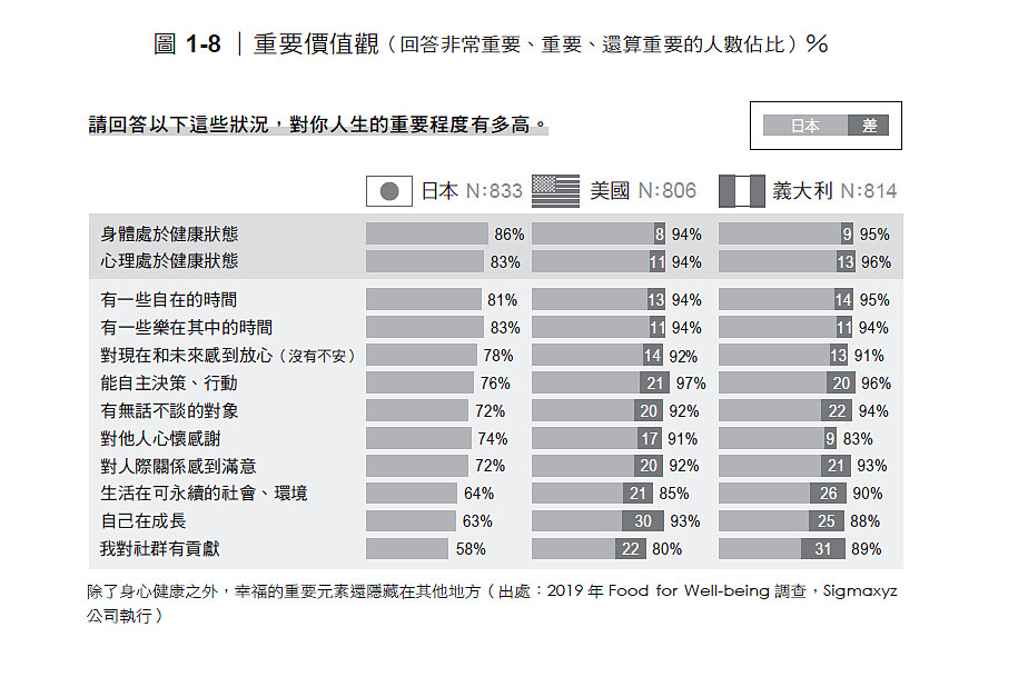 調查結果如圖1-8 所示(在調查當中是將前述的8 種狀態再細分為12 個狀態選項,以此來詢問受訪者)。不論是在哪一個國家,身心健康都同樣備受重視,但其實還有一些項目同樣受到看重,重視程度甚至還超越健康。以日本為例,我們可以看出「有一些自在的時間」和「有一些樂在其中的時間」,也是帶來幸福感的重要元素。在美國和義大利,則是「能自主決策、行動」比身心健康更重要。此外,「自己在成長」在美國,以及「生活在可永續的社會、環境」在義大利,顯得比其他國家更受重視。先明白這些是帶來幸福的要素,再試著將它們換成「飲食所提供的價值」來思考,應該就能找到一些新的切入點。