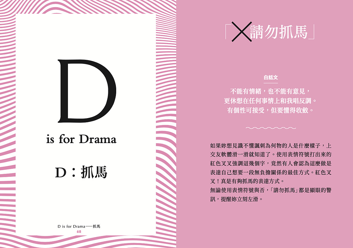我的任務是要用這本輕薄可愛的A到Z指南拆解這些屁話。我要為妳解讀交友軟體語言,破解所有那些容易忽略的、有時充滿惡意的性主義潛台詞。
