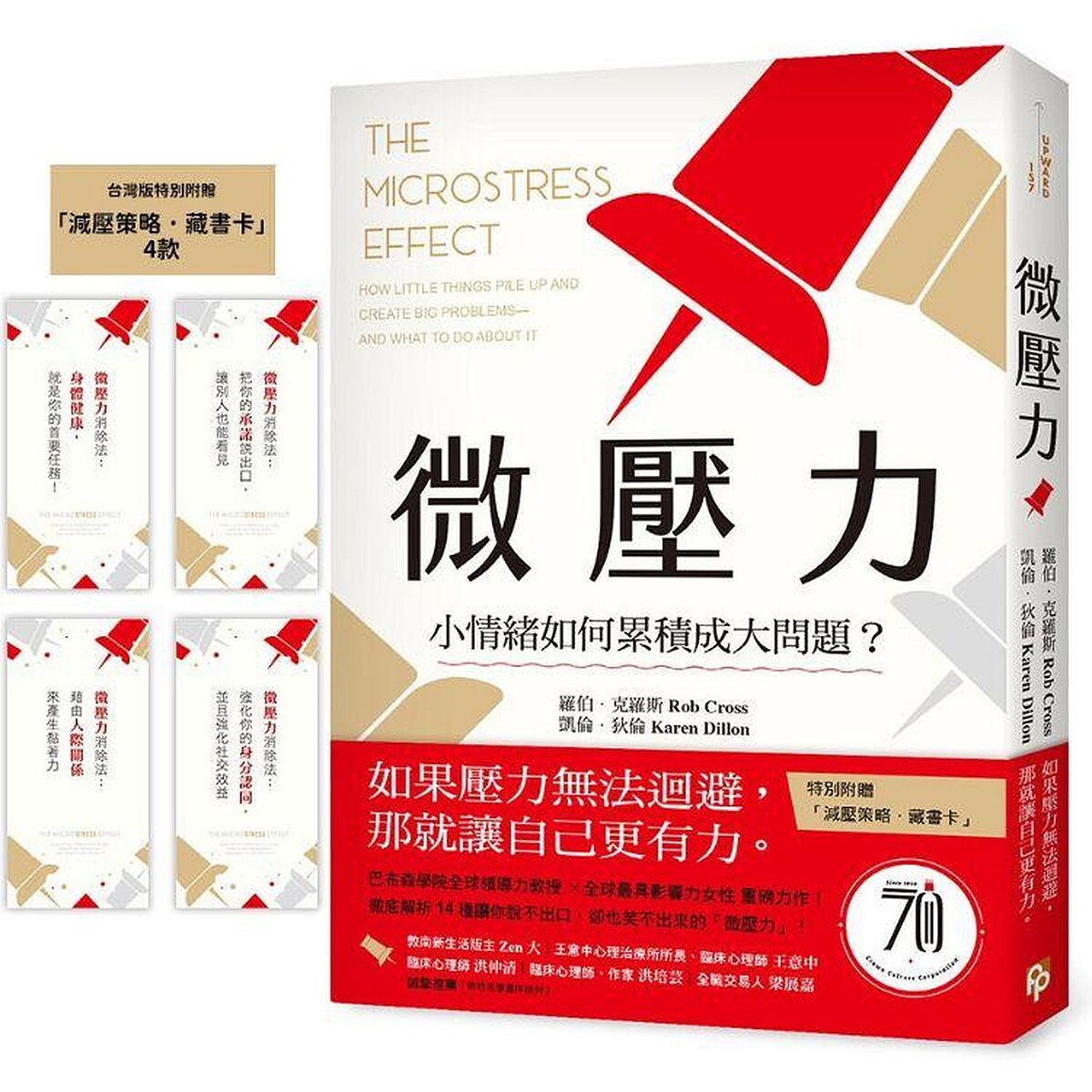 《微壓力》一書揭密這些圍繞在家人、同事、同儕之間,無法被輕易察覺的壓力,並在無形之中造成精神耗損,使我們陷入負面的惡性循環。書中列舉14種可能形成微壓力的根源,並提供實用的解方。讓你能夠在面對紛紛擾擾的世界時,不這麼容易被這些無形的微壓力操控情緒,以穩定且健壯的心靈,找回真實的情緒。