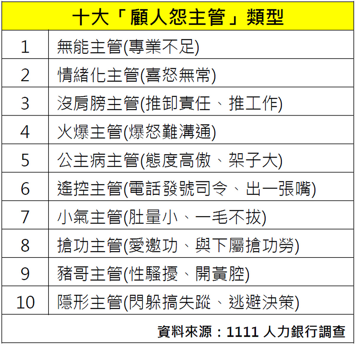 1111人力銀行公共事務部暨職涯發展中心總經理李大華指出,主管與下屬多數因權力不對等、甚至立場不同,因而較容易在工作中產生摩擦,調查中也透露出,主管專業程度不足,易流於下錯決策造成部門績效不彰,部屬工作士氣低落,惡性循環的結果,不但人心浮動,更影響企業的整體營運及競爭力。整體而言,主管的專業能力更勝於擁有好脾氣及好個性,才能贏得部屬的信服及青睞。