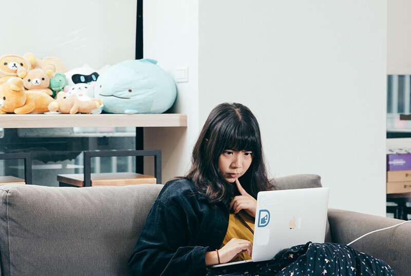 抱著筆記型電腦盤坐在沙發,礙事的鞋子早已脫下放在地板,台灣最大的原生社群網站、擁有超過400萬「卡友」的Dcard人資經理、26歲的彭睦潔雙手在鍵盤上飛舞,在Slack群組與人資夥伴打招呼,開啟遠端工作的一天。實施遠距上班已近一個月,適逢住家附近施工的彭睦潔,今日選擇在幾乎空無一人的Dcard辦公室上班。