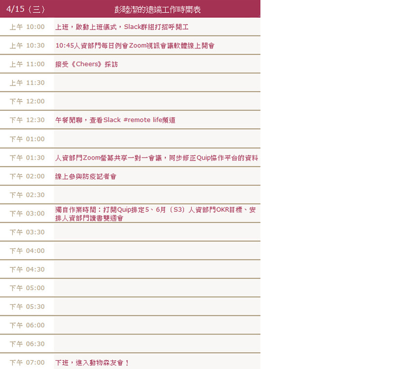 疫情記者會結束後,彭睦潔開始制定整個人資部門第3季到第5季之間應該要完成的進度,選出要讓同事分享的讀書會文本;也處理前幾天未完成的事務,等到晚上7點下班後,再和同事開始另一段線上的相聚,此時就是彭睦潔要準備賣水果(動物森友會的遊戲任務)的工作了。