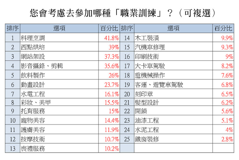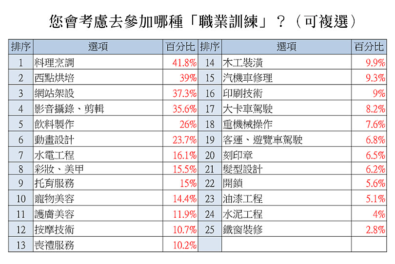 不少勞工嗅到這波警訊,紛紛未雨綢繆,急尋對應方案。最多勞工選擇「找兼差工作」(58%)、其次是「找新的正職工作」(47.7%)、以及把握時間進修,「去進修補習,學一技之長或考證照」(32.6%)。若被裁員,也有高達8成勞工考慮參加「職業訓練」,可見勞工在這波壓力下,對於求職和自我學習的表現更積極。
