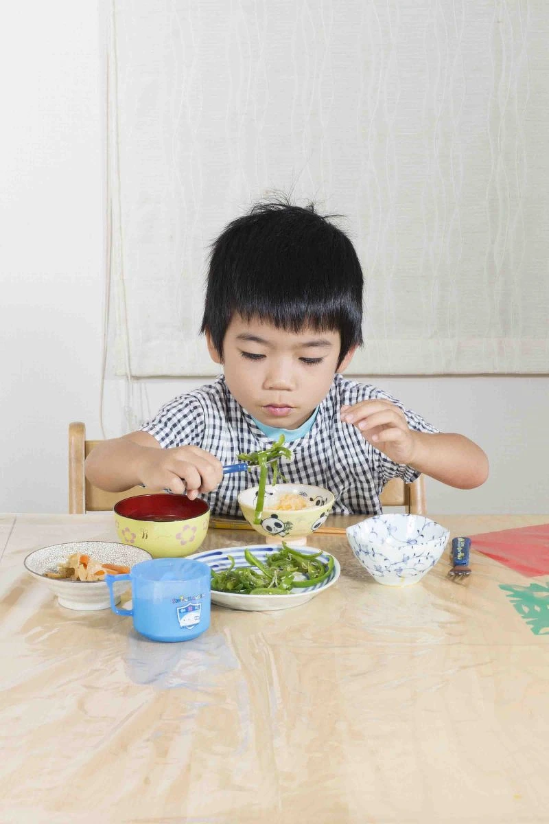 如果 Koki 和哥哥可以選擇的話,他們比較偏愛美式早餐。有時候,母親 Fumi 會按著他們喜好,讓他們以麥片與甜甜圈作為早點,但她其實更想讓孩子在成長過程中,從食物來了解日本文化;所以圖片中,Koki 吃的都是道地日式早點,例如芝麻拌炒小魚乾與青椒、生蛋醬油拌飯、芝麻油炒牛蒡根、味增湯,還有葡萄、梨子等水果,再搭配一杯牛奶,營養滿點。