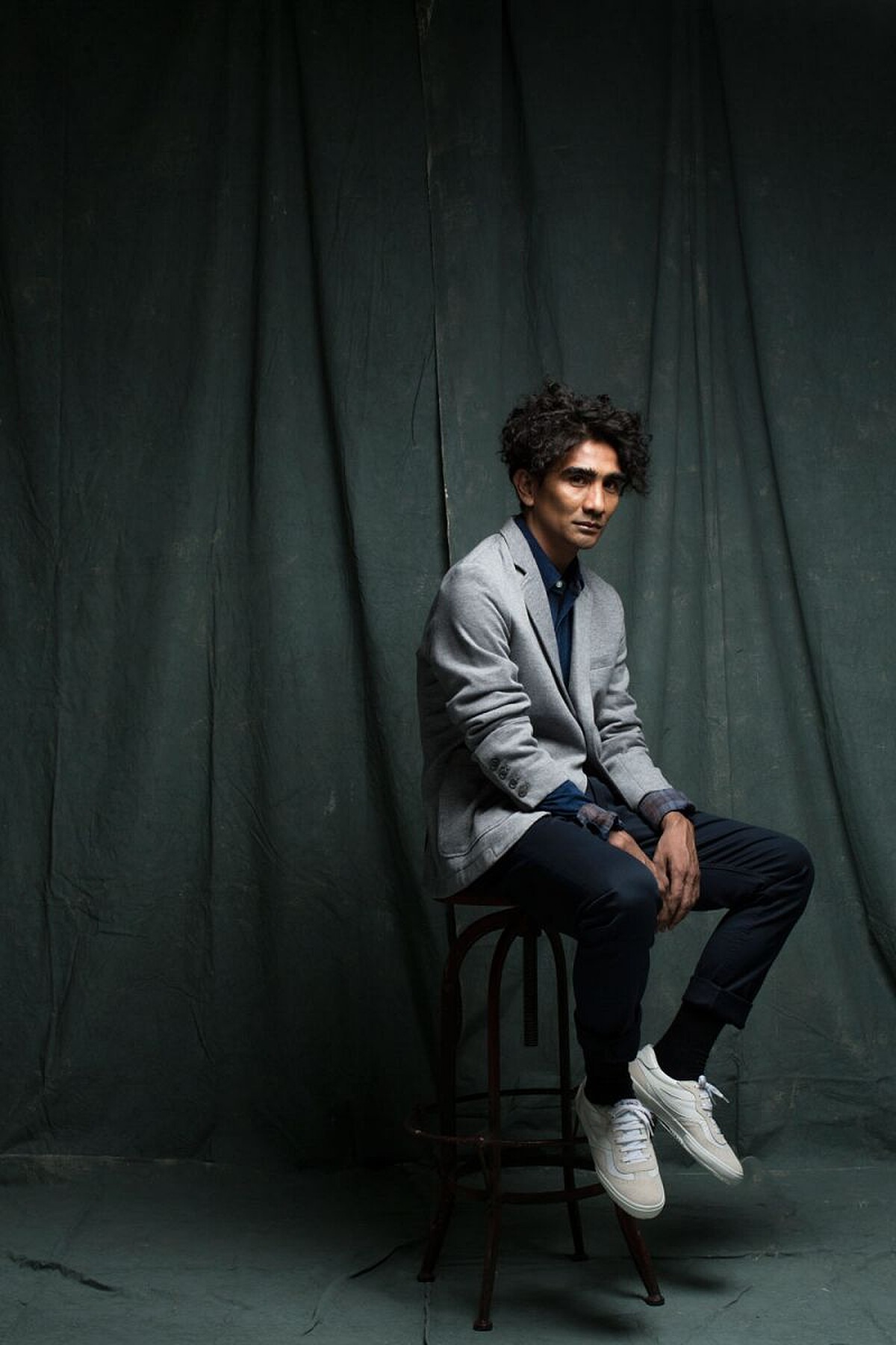服裝/藍色襯衫、灰色西裝外套、藍色長褲,all by Brooks Brothers;白色休閒鞋,Superga。