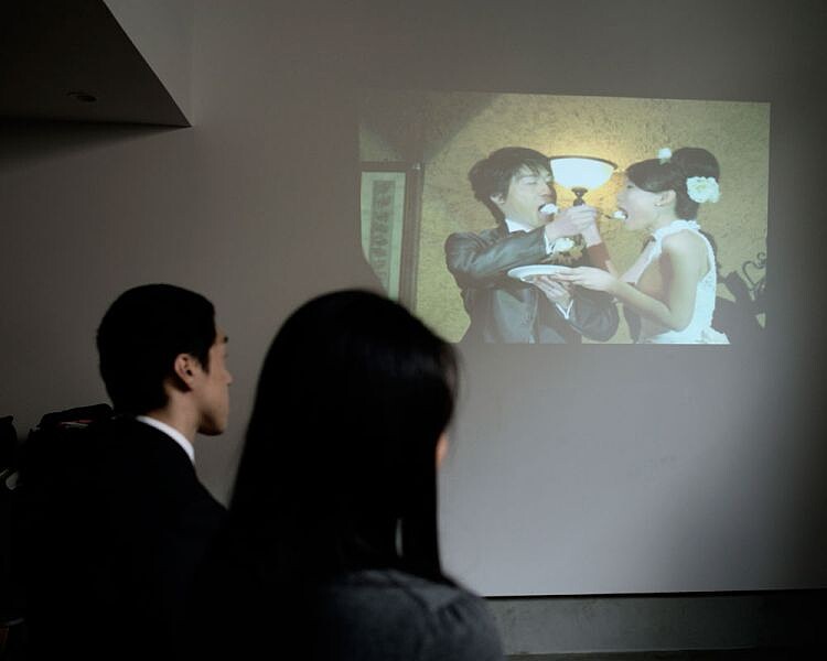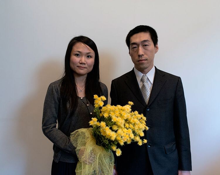 寺井先生今天手持黃色花束,迎接男女雙方—穿著黑西裝、繫著白領帶的久村淳(Sunao Kumura,38歲),和幾個小時後就不再是他妻子的久村里紗(Risa Kumura,30歲)。西方人視為象徵「失去」或「喪失親友」的菊花,在日本卻意味著神聖,而黃色也同樣代表著尊貴與成功。