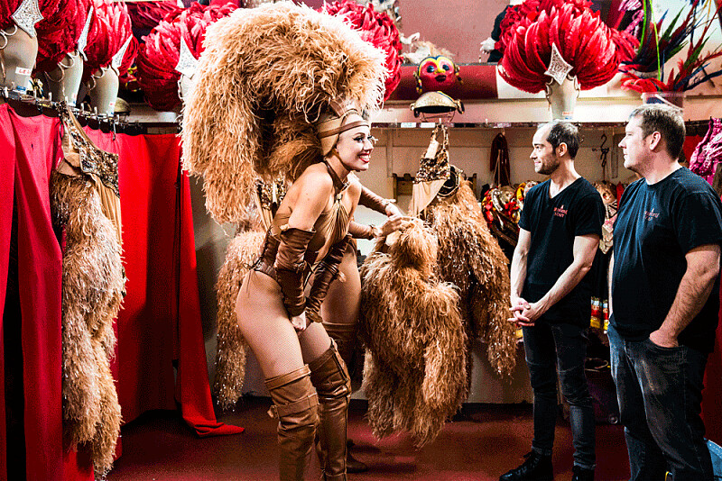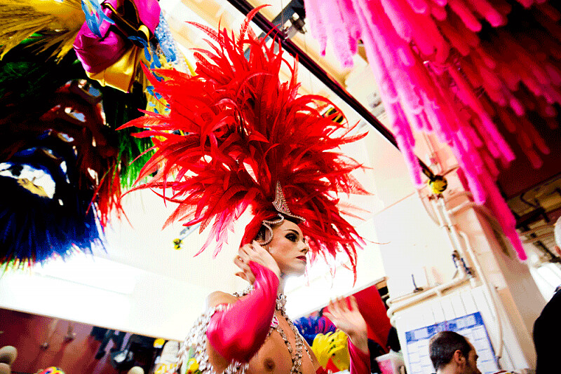大約下午一點,排舞時間到了。許多舞者可是不辭千里來這工作的,光這就令 Géraldine 無比訝異:「來自世界各地的觀眾跑來紅磨坊看秀,但舞台上就有來自14個國家的舞者,你要知道,這可是法國。」最驚人的是,儘管他們對舞者的身高(175公分)與體態有基本要求,這裡並沒有統一標準。傳統的康康舞隨著時間演進,成為一種舞蹈技藝,靠的是良好的身體控制與密集訓練。舞群裡有很多人來自澳洲,因為紅磨坊團隊一年畢竟會去當地舞蹈學校參訪一次以遴選舞者。身為兩名獨舞者之一的 Amanda,就是被選上而來巴黎的。她坦承每天晚上都會花一個小時和家鄉的媽媽講電話,雖然她在這裡找到工作上的家人,但離鄉背井的苦還是很難適應。