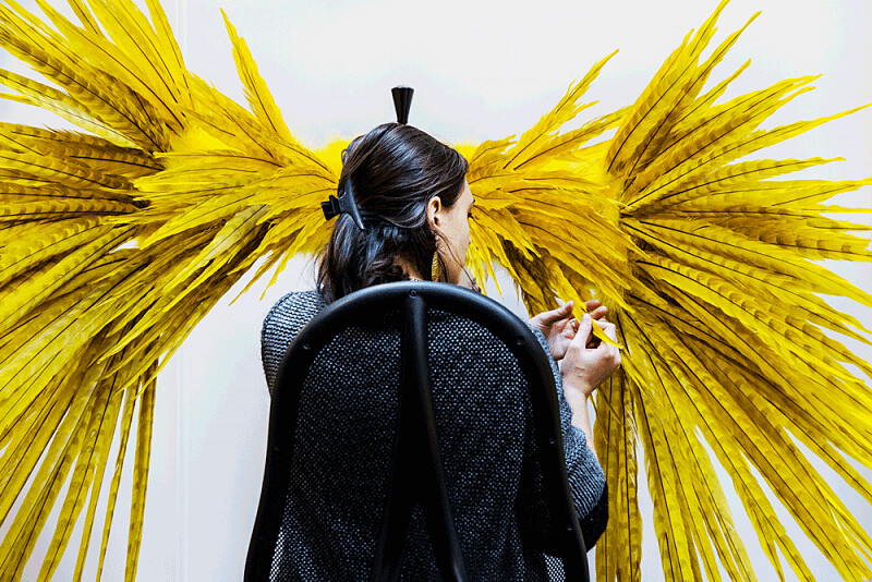 Céline在上秀前把羽毛安置好。