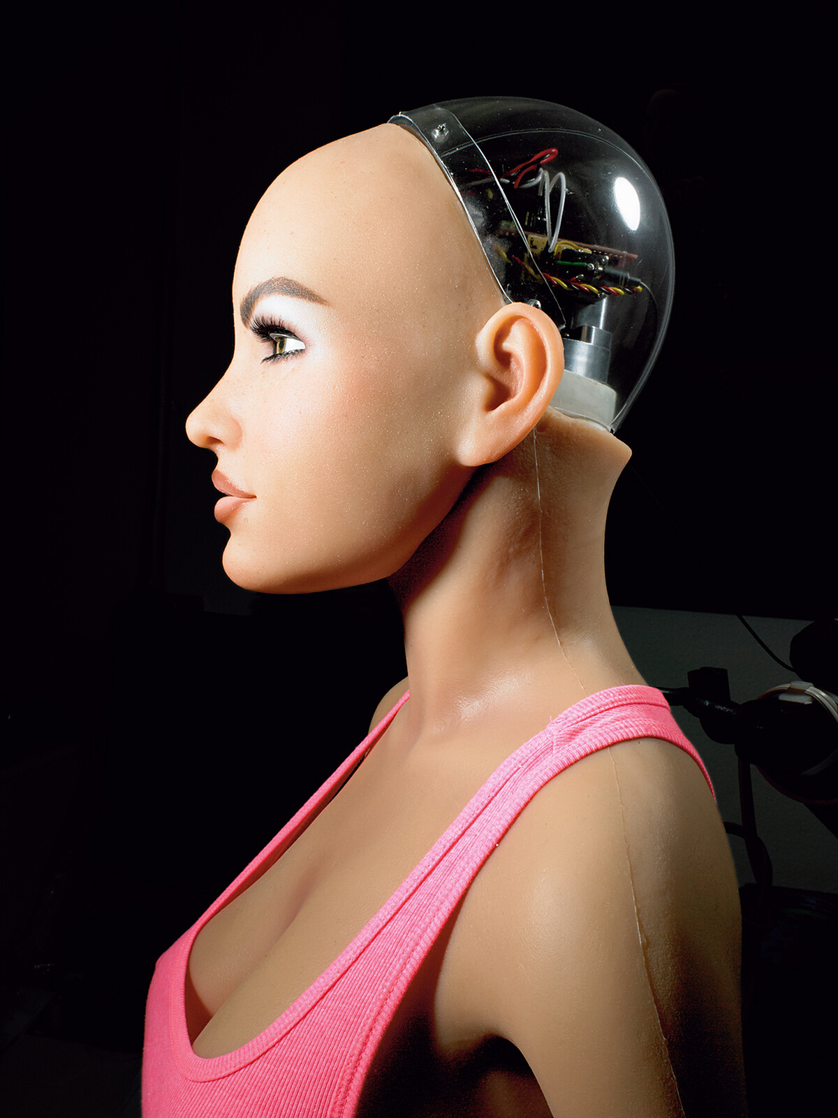 「外頭有更多女人自我物化的娃娃,數量遠超過我作的。」他邊說邊帶我穿越房間走向哈摩妮。「所以當有人跟我說,我這樣是在教人把人當成物品時,我會說,完全相反,我們是把物品擬人化。」