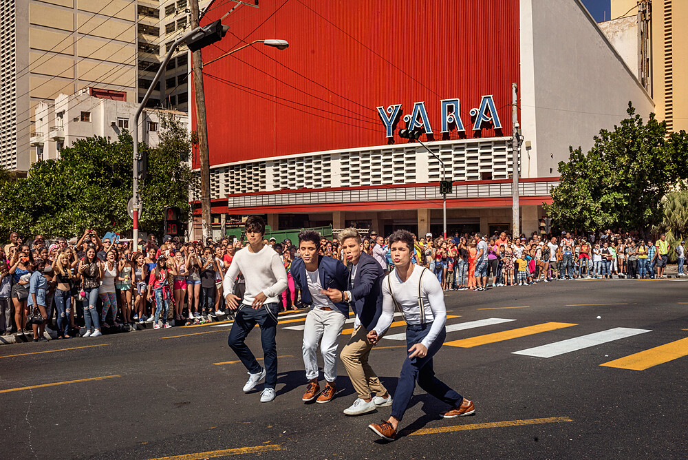(古巴哈瓦那自由酒店前方,街道兩旁的粉絲正熱情觀賞著雷鬼動樂團「Angeles」,拍攝音樂MV的畫 面。)