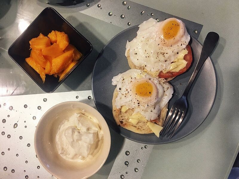 我平時喜歡吃「真正的食物」,飲食均衡,減少澱粉,會自己做料理。照片裡的是無糖優格佐芒果,和自製水波蛋和番茄滿福堡。
