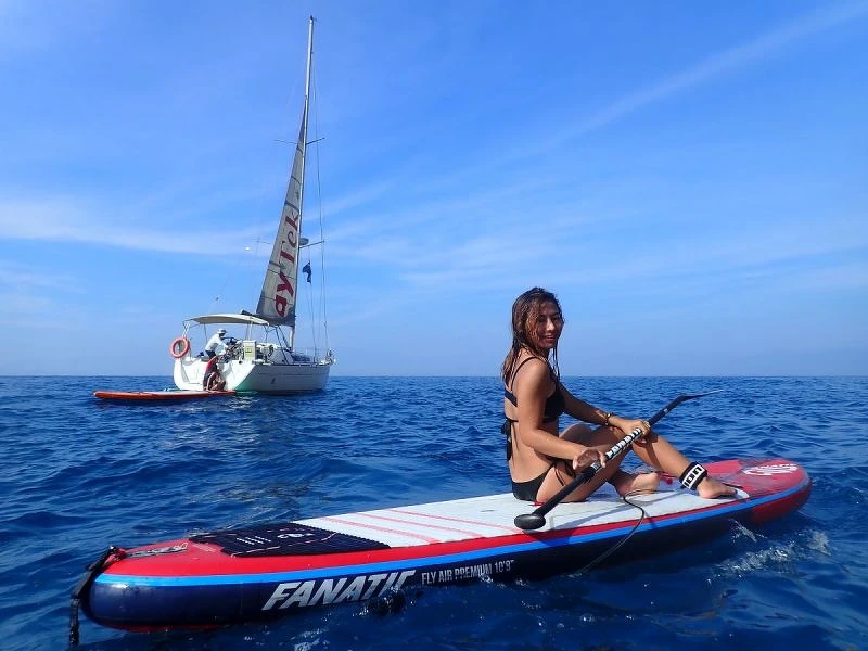因為SUP板浮力很足,也不容易翻覆,所以新手在平靜的水域真的很安全。假如沒有安全感的話,跪著或坐著划也可以,一覺得不穩只要重心降低就好。即使落水也不要緊張,因為板子很大,就像你的救生衣,再爬上去就好。