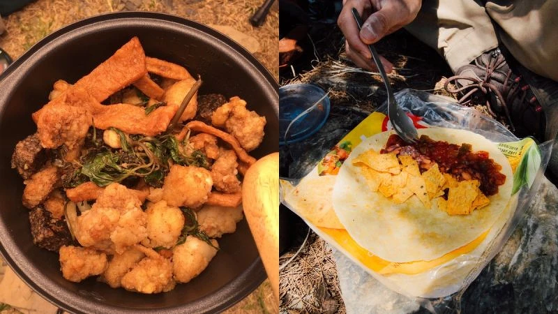 帶上山的食物原則就是易保存、耐碰撞、好收納。狂的東西我們煮了很多,蒜片嫩肩牛排、鹹酥雞、緹魚法式麵包,其實煮什麼都好,但到山上都走了這麼長的路,不妨煮頓自己愛吃的犒賞自己。