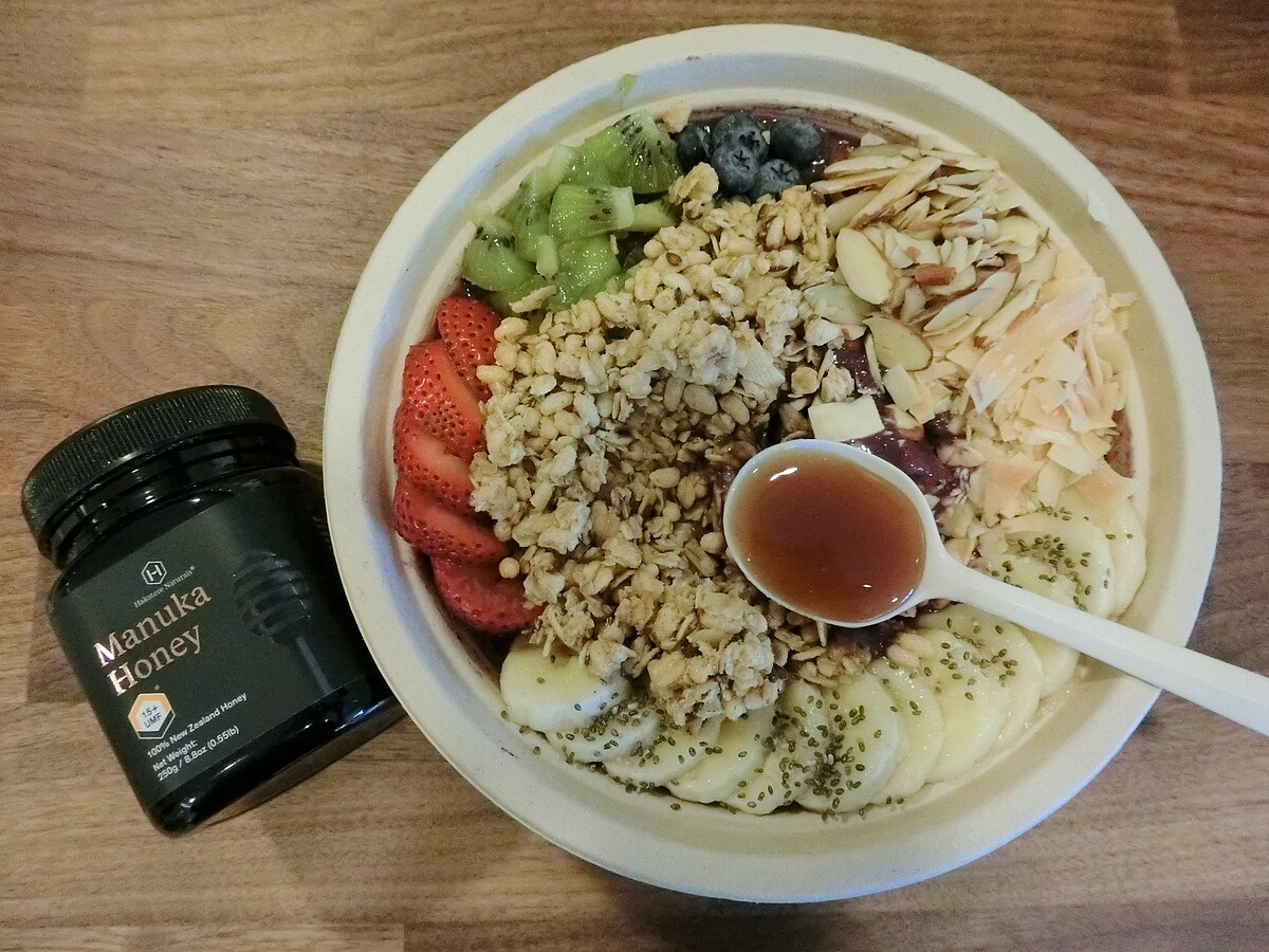時間和金錢一樣,拿來幹嘛都好就是不要拿去給醫生。如各位所知美國醫療費非常驚人(而且看病很麻煩要預約)所以平常就得注重保養。我自己在餐桌上一定都會放以抗菌力聞名的麥蘆卡蜂蜜。快要感冒、腸胃不適時麥蘆卡蜂蜜是很棒的救兵。怎麼吃呢?我平常會泡冷溫水服用也會拿來搭配Acai Bowl。
