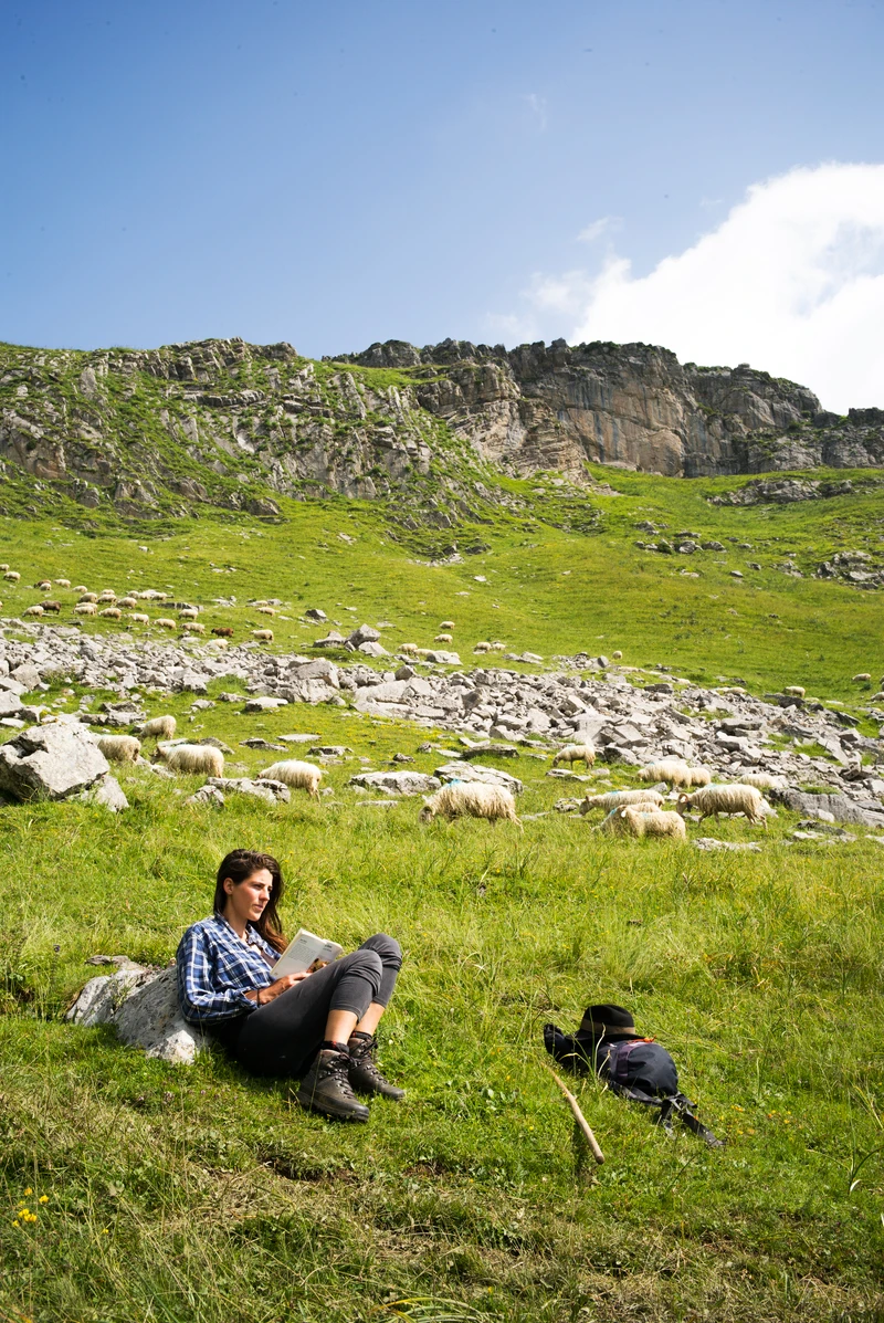 我們見到克蕾蒙絲時是六月初夏,正是高山牧場放養季開始的時節。牧羊人逐草場而居,夏季會把羊群趕至海拔較高的高山草甸,那裡水草豐美,足夠羊群飼養增肥。此時山間已經湧起熱浪,但天氣再熱,她也不能在遷徙時穿著短褲和無袖上衣,因為不便於長時間在山間行走。牧羊人要憑藉登山杖,緊貼著斜坡全速向上攀爬。而遠處,克蕾蒙絲的羊群仿佛一條奶白色的河流,沿著山谷向高處蜿蜒。