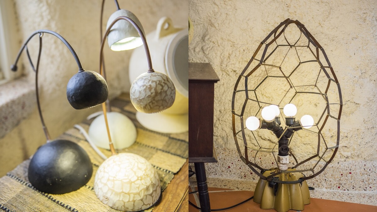 (何老師喜歡利用廢棄的浮球和冷氣銅管創作燈具,左圖為「漂‧亮」「小米燈」和「鷺鷥燈」,右圖是為了紀念海龜媽媽而創作的「生生不息」)