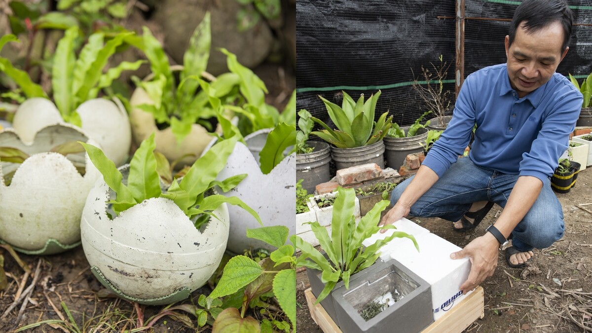 老家住台北的何俊賢其實跟種田不熟,坦承自己一開始都在亂種,但「需要為發明之母」,十多年來他不斷摸索開發一套獨特的自然農法。放眼周遭最常遭遇的垃圾是浮球和保麗龍,他煞費苦心創造循環經濟。經過巧思設計,保麗龍箱成了「零澆水也能活」的智慧型雨水儲存菜盒兼「碳捕捉器」。割開的浮球能種菜,也能做立燈,做矮凳,做音響,海洋垃圾在他巧手中化為優雅的鷺鷥,俏皮的青蛙,變身別出心裁的工藝品。