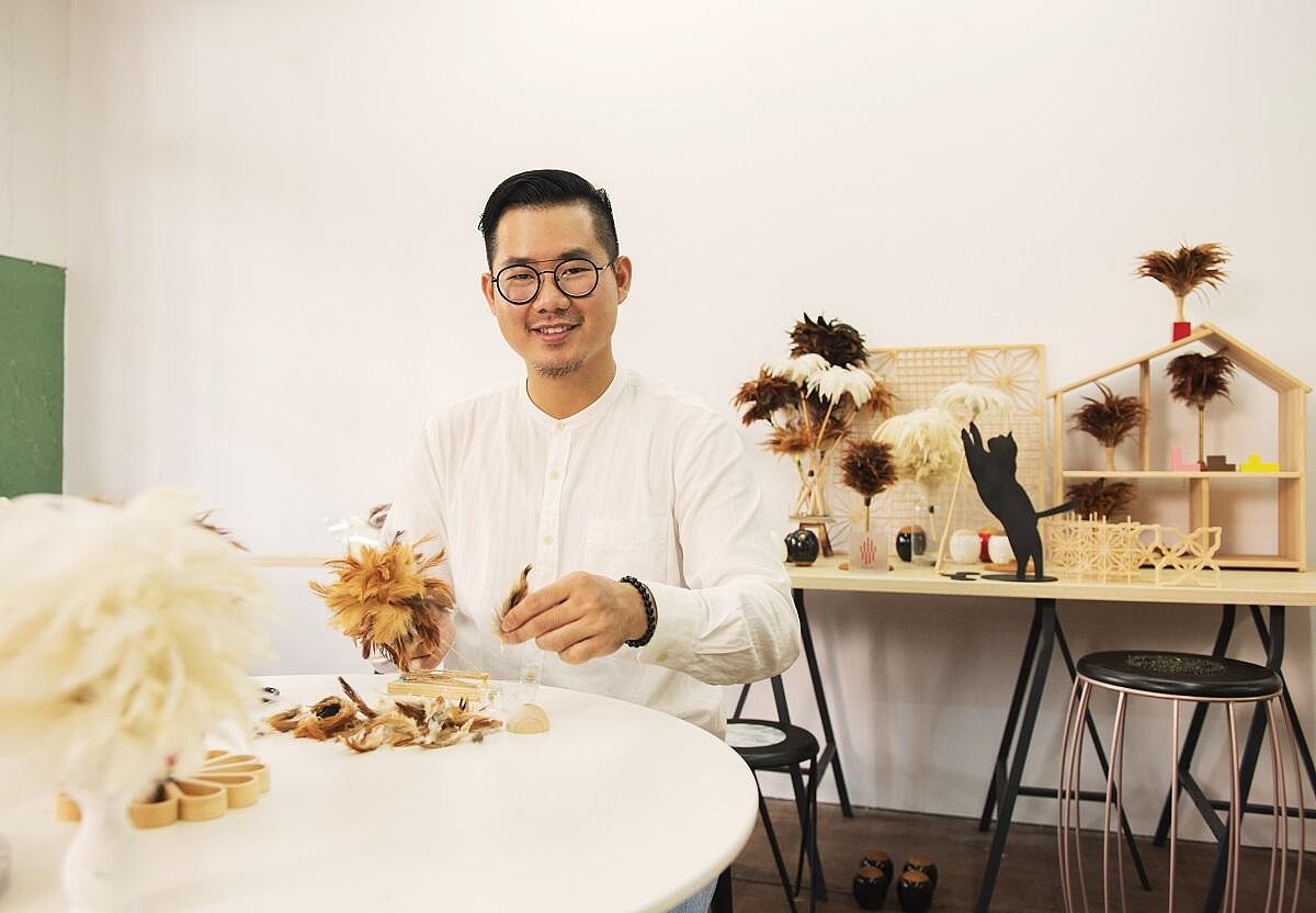 成立品牌「手手」後,第一個推出的作品是結合中國結編織技法的「吉祥花鼓」系列家具,但因家具門檻高,市場反應不如預期。在思索下一步時,他想起一段往事:他曾在台北設計之都展覽上,被轉角一張一對老夫妻埋首做雞毛撢子的巨幅攝影震撼,「我足足站在那十分鐘,太美了!下一秒想到的是,對啊,雞毛撢子去哪裡了?為什麼在我們的生活空間已經看不到了?」