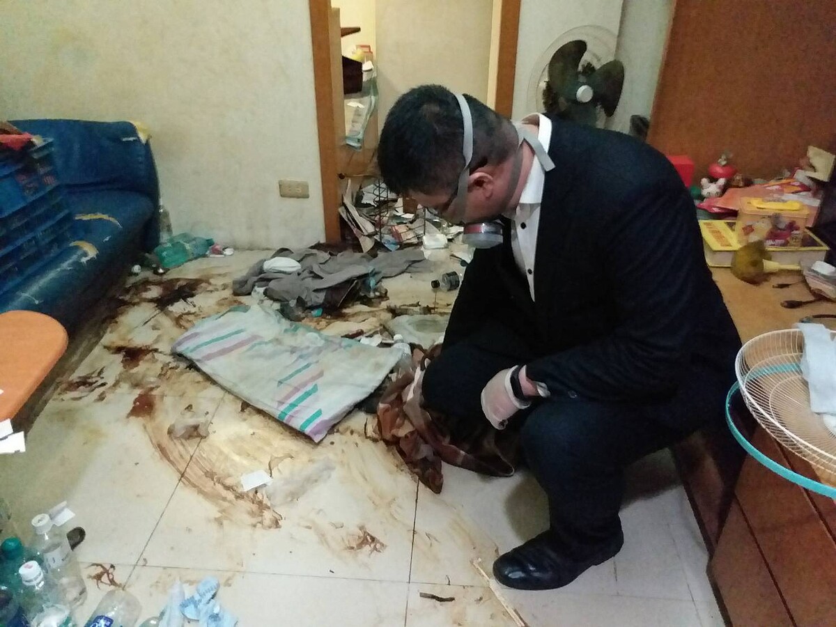 在我很悲哀地鏟臉皮的時候,我就知道這個行業裡真的沒有專門在做這件事的人。遇到「非預期死亡」的特殊狀況(例如慘不忍睹、血肉模糊、髒亂不堪的現場),如果找一般清潔人員進行處理,可能剛看到現場就立馬奪門而出,收驚都來不及了;儘管殯葬從業人員願意進行協助,但畢竟不懂專業清潔,僅靠三大神器「鹽酸、拖把、漂白水」處置,反正把痕跡處理掉、東西丟掉、味道蓋住就好,造成「專業的不敢做、敢做的不專業」的弔詭現象。