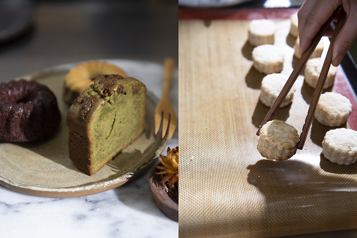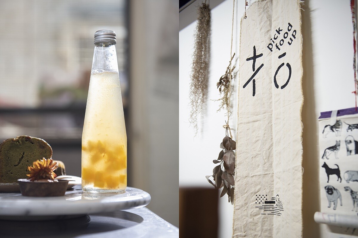 招待來客的甜點盤上,裝著兩塊精緻的小點,南瓜柳橙蛋糕的原料是市集農夫給的醜蔬果,而紅豆艾草糕的紅豆原料則是有機進口商的即期品,加上朋友從日方友人那裡獲贈、卻不知如何使用的艾草粉,便成為一道風味特殊的甜點。Pick Food Up扌合生態廚房的創立者黃宣尹,堅持使用別人打算淘汰的即期品或醜蔬果作為主原料所製作出來糕點,十分好吃,卻因每回拿到的東西都不太一樣、無法使用固定的食譜,得絞盡腦汁,對食材搭配非常有興趣的她倒不以為苦,她說:「面對食材我不是去試,而是去感受。」