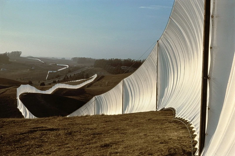 此作品與1972年的〈山谷帷幕〉有些雷同,或許因為前次在山谷架設作品時遇上暴風而困難重重,Christo & Jeanne-Claude這次選在加州北部廣袤的丘陵地上立起綿延的白色尼龍布料。雖然沒有了暴風,卻迎來其他挑戰,不滿Christo & Jeanne-Claude的環保人士一狀告上法院,經過數場訴訟與公聽會後,才終於架設成功。布面隨著光線變化渲染上不同色彩:豔陽下猶如熠熠閃耀的銀色長城,夕陽裡則幻化為丘陵上一條艷橘綿延的彩帶。