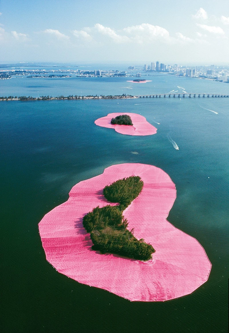 1983年,Christo & Jeanne-Claude挑選邁阿密比斯坎灣(Biscayne Bay)的11座無人群島,在周圍設置漂浮的粉紅色尼龍布料, 島嶼們就像是海上爛漫的華爾滋舞步。裝置僅維持了短短兩週,卻吸引了上千名藝術追隨者前來爭睹,並成為邁阿密文化歷史的重要地標。〈包圍群島〉可說是他們最上相的作品,同時挑戰了藝術欣賞的常態。因為位於海中,對觀者來說「現場」 並非最佳的欣賞管道,而要透過電視傳媒等才能一覽全貌,似乎宣告著當代藝術與新媒體合作的時代降臨。