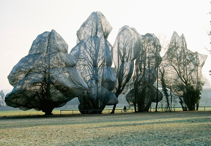 1989年的秋天,瑞士貝耶勒基金會美術館(Fondation Beyeler)及其附屬公園形形色色的樹木褪去舊葉,換上新裝。Christo & JeanneClaude表現他們對材質特性的高度 掌握,以農民冬日保護作物的透氣尼龍布綑包枝葉,打造宛若立體派畫家的筆觸,又帶著如夢似幻的感受——順光時樹木是散布在草地上壯觀而耀眼的抽象雕塑,逆光時尼龍布則如蛛絲透出纏捲的枝枒。