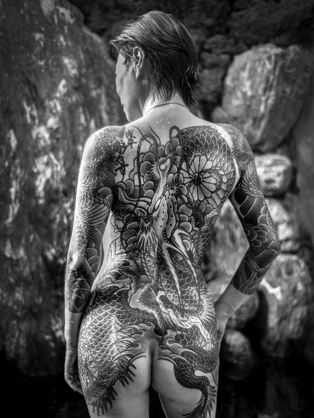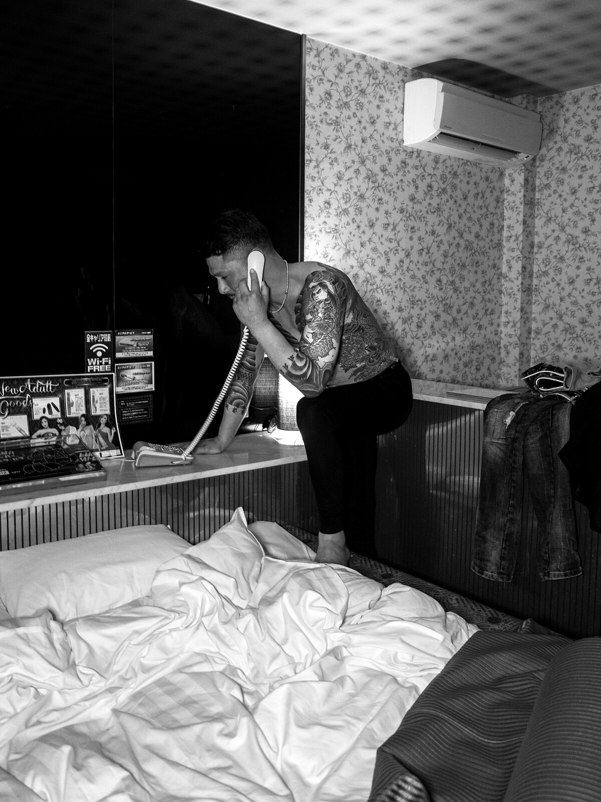 讓我們回到先前提到的刺青,這是 Jafé 鏡頭下重要的元素。所謂的「入れ墨」(入墨)是極道的傳統,經常會覆蓋身體大片的皮膚。Jafé 表示,入墨展現刺青者有能力承受痛苦,呈現出他/她有何等強大的韌性。「刺青就像保護他們精神的盾牌,圖像每每透露刺青者的個性或過往。而對於男性來說,刺青往往與他們所屬的群體有關——事實上,他們大多會在胸前紋上老大或集團的名字。」你覺得好看?多數日本人可不那麼想,「我們感受到刺青的美麗程度,就是它在日本被視為禁忌的程度。一般而言外界看不到這些女性的刺青,那是保留給她們的愛人的。」